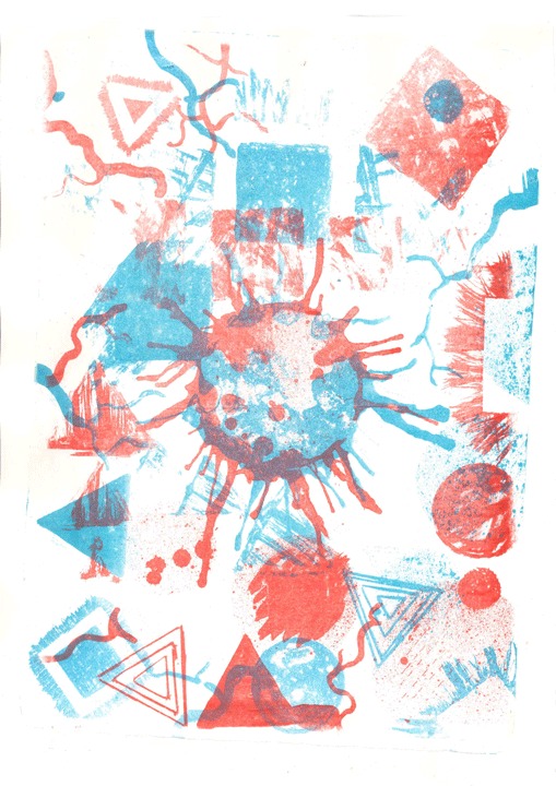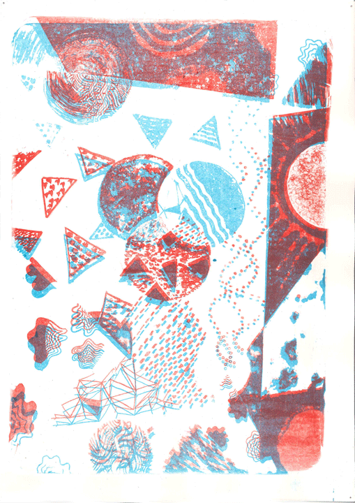 Ces animaglyphes sont faits à partir des lithographies, des gravures sur pierre donc, une bleu et une autre rouge, superposées. Je considère cette vibration comme étant de l’animation, même ténue, dûe à la perception et à la manière dont notre cerveau interprète les images. Cette frontière entre un médium et un autre m’intéresse particulièrement.