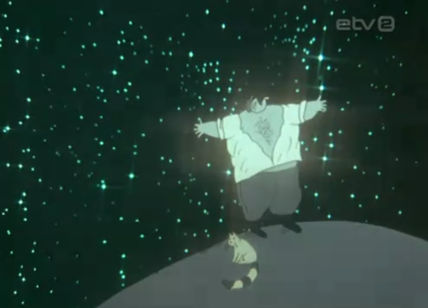 GS: In Breakfast on the grass, there is the scene of the man drinking from a bottle and crashing the bottle down. He opens his jacket and in the continuity the background opens in the same way to reveal a new background of starry sky where he stands alone with the cat from the previous background. The man kicks the cat which goes up to the stars. The man turns on himself and falls. And during his fall the sky background folds and we retrieve the first background.