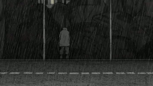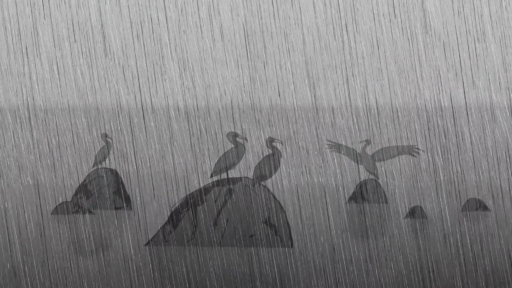 OP: We saw the film on the big screen at a festival somewhere, and we both felt that this dream was too much, so we removed it. So we remade the film. We removed that sequence and replaced it with the sequence of the cormorants standing in the rain. We created the graphic pattern of falling rain, without characters or background, with the sounds of the cormorants. The film as a whole was better once that sequence with the elephant was deleted.