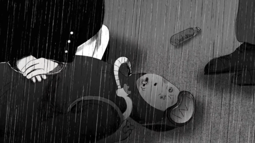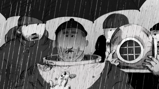 I added a few jokes and gags. I tried to be subtle, without overdoing it. The character design makes them look very clumsy. It seems like their clothes protect them from the rain, but at the same time, they are quite ugly and don’t move much.