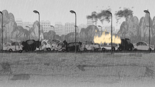 There are distinct scenes: near the sea, the car accident, etc. There is a gradual development: all the cars stop, then this quiet driver arrives and has a heart attack, etc. I don’t even remember what the script looked like, I mainly created the film scene by scene.