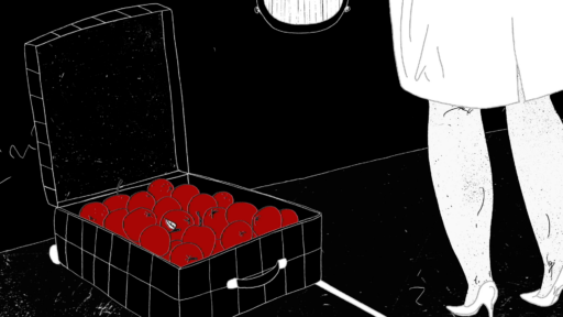 OA: In Divers in the rain, in the dream of the woman on the ship, beside the stork is also a suitcase with apples and the apples follow the wave of the ship. What idea did you have in mind when you developed this part?