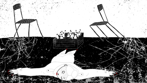 The chairs are using their legs like animals moving and are making steps to the direction of this box with bottles. In this drawing I made very precise timing of the scene: