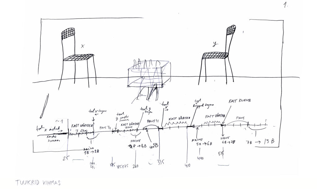 OP: This extremely distinctive and strange sound gave us a feeling of danger, of something being wrong. It inspired Priit to design the two scary chairs. We talked about it with Horret and he built something that was very close to the sound that had inspired us.